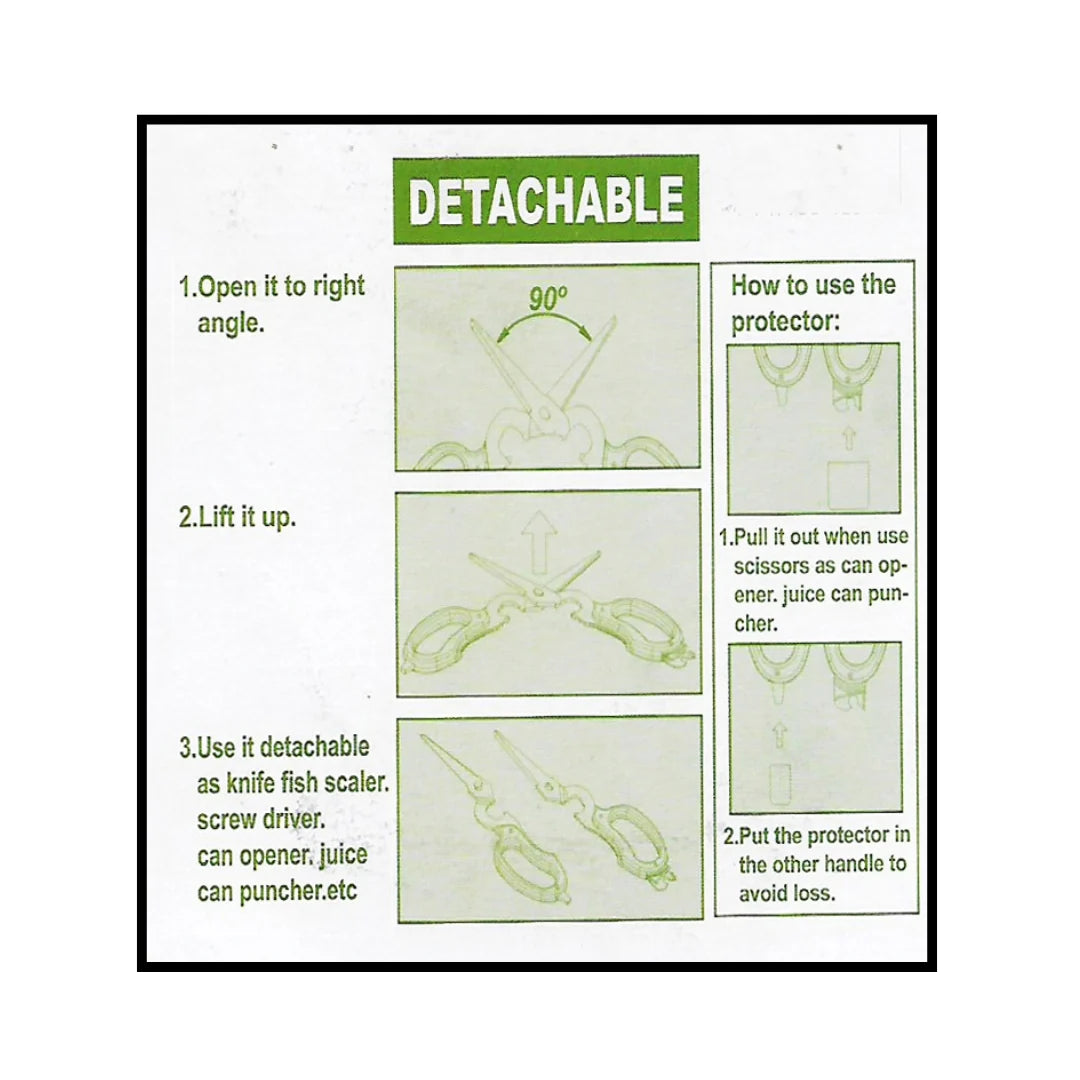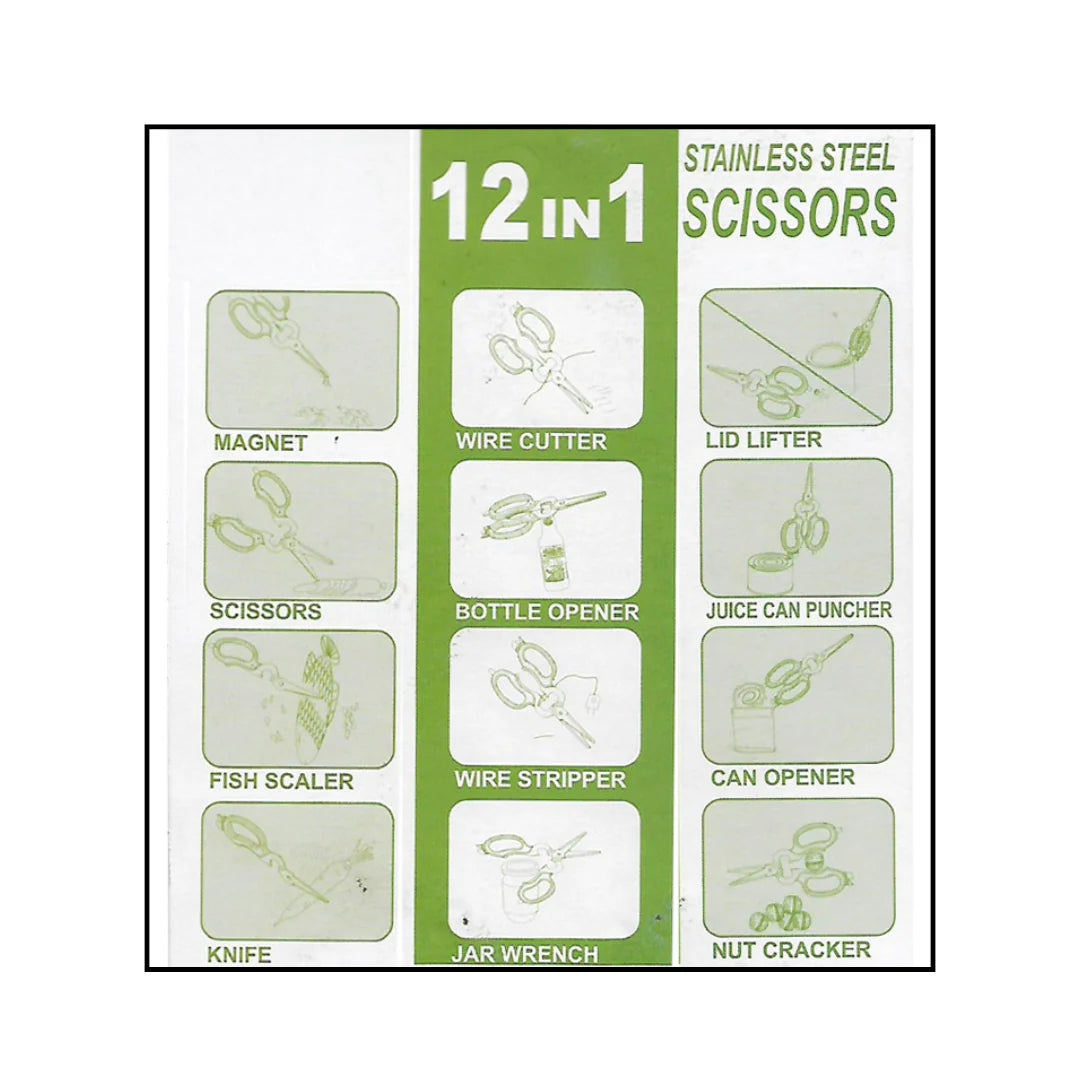 - 12 functions in one tool: scissors, knife, bottle opener, can opener, juice can puncher, fish scaler, wire cutter, wire stripper, nut cracker, lid lifter, jar wrench, magnetic holder