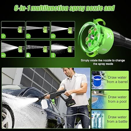 - 💦 6-in-1 Nozzle: Various water jet settings for different surfaces (0°, 10°, 15°, 20°, 25°, 40°, shower mode).